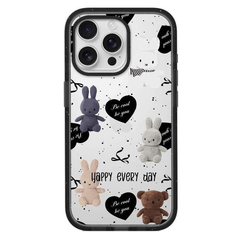 Adorned with plush bunny and bear dolls, this soft-aesthetic phone case features heartwarming phrases like “Be cool, be you” and “Happy every day.” Its customizable back makes it both functional and visually charming — perfect for fans of cozy, cute styles.