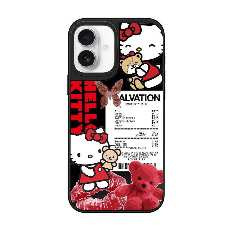 A bold mix of Hello Kitty, Christian receipt art, and red teddy accents. Perfect for fans who love cute design with deeper meaning—fully customizable.