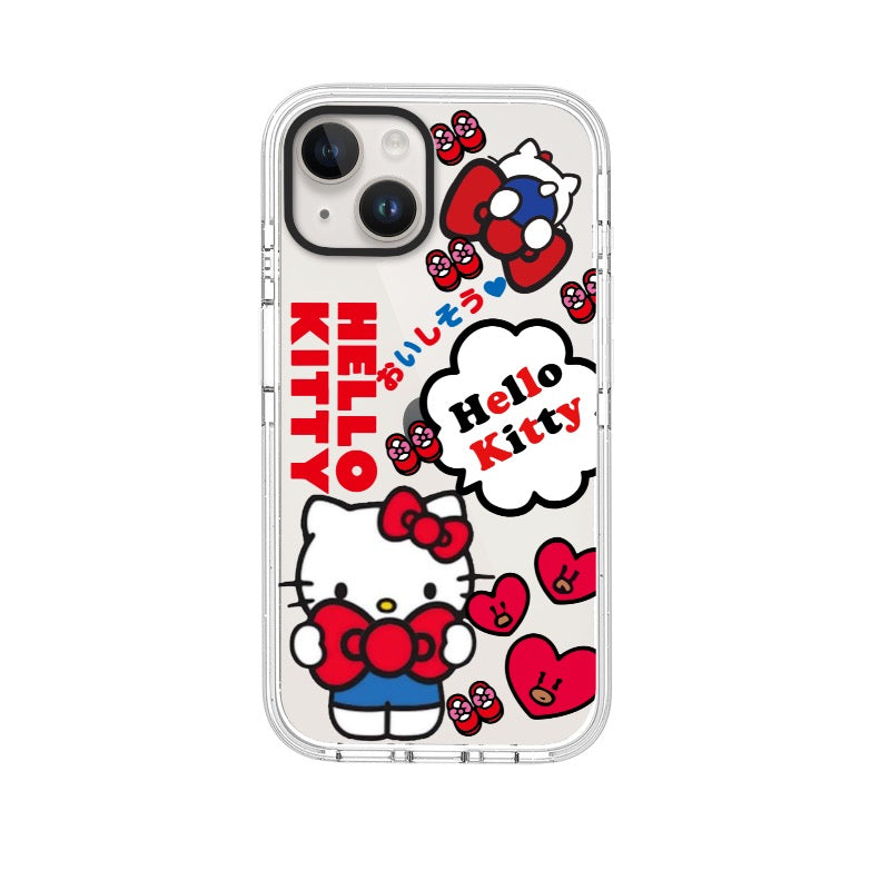 This transparent phone case features bold Hello Kitty graphics, Japanese text accents, and playful hearts in classic red and white. A perfect customizable accessory for fans of sweet kawaii charm.